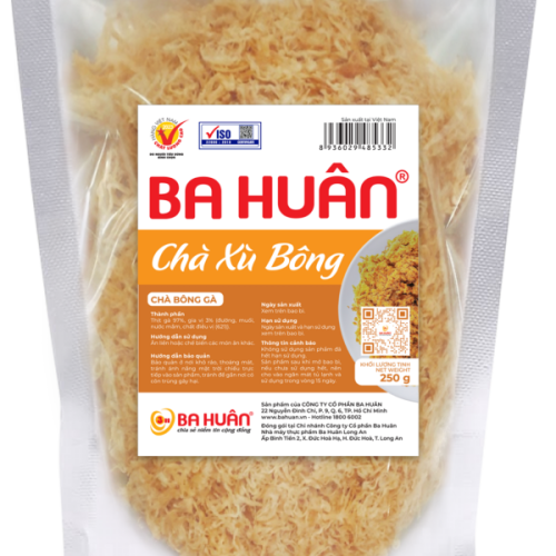 Chà xù bông (chà bông xù) được chế biến từ nguồn thịt gà chất lượng cao, chọn lựa kỹ càng từ trang trại Ba Huân, áp dụng công nghệ hiện đại và đạt tiêu chuẩn an toàn vệ sinh thực phẩm.