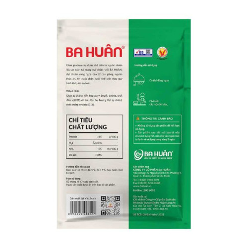 Chân gà chua cay đặc biệt Ba Huân được sản xuất từ hệ thống được kiểm soát chặt chẽ theo nguyên tắc chuỗi khép kín “Thức ăn chăn nuôi – Trang trại chăn nuôi – Nhà máy chế biến thực phẩm” (Feed-Farm-Food) nhằm mang lại giá trị dinh dưỡng cao nhất và vệ sinh an toàn thực phẩm đến người tiêu dùng.