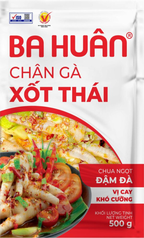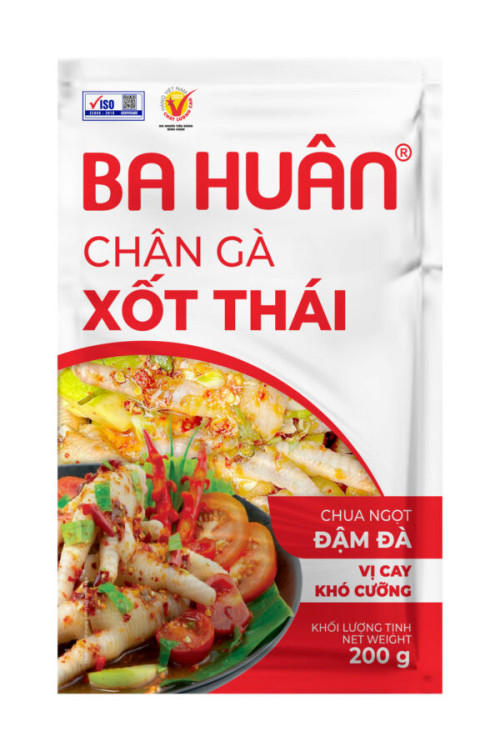 Chân gà xốt Thái được sản xuất từ nguồn nguyên liệu thịt gà chất lượng cao, chọn lựa kỹ càng từ trang trại Ba Huân, sử dụng công nghệ hiện đại và đạt tiêu chuẩn an toàn vệ sinh thực phẩm.