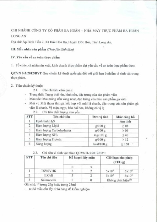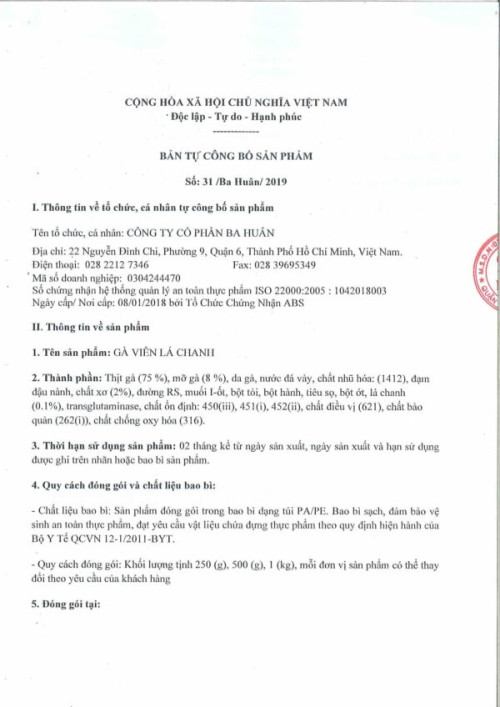 Gà viên lá chanh Ba Huân được sản xuất từ hệ thống được kiểm soát chặt chẽ theo nguyên tắc chuỗi khép kín “Thức ăn chăn nuôi – Trang trại chăn nuôi – Nhà máy chế biến thực phẩm” (Feed-Farm-Food) nhằm mang lại giá trị dinh dưỡng cao nhất và vệ sinh an toàn thực phẩm đến người tiêu dùng.