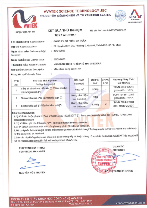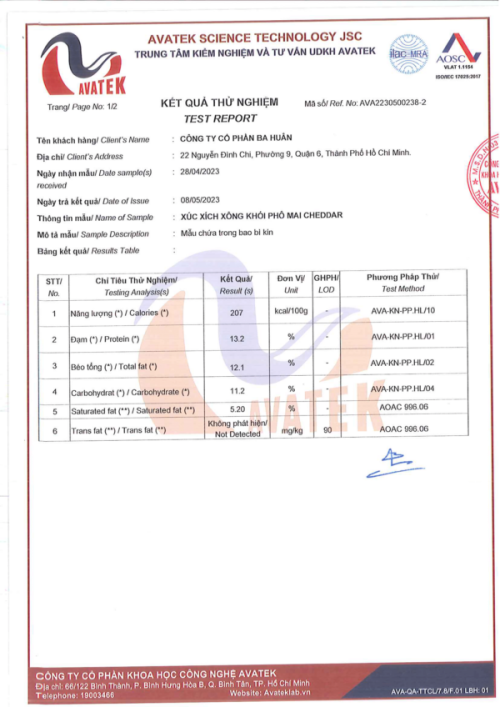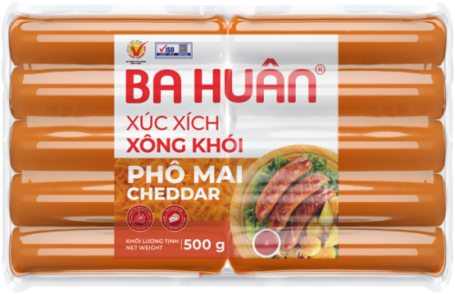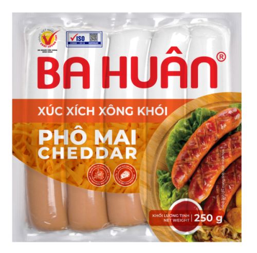 Xúc xích xông khói phô mai Cheddar được sản xuất từ nguồn nguyên liệu thịt gà chất lượng cao, chọn lựa kỹ càng từ trang trại Ba Huân, sử dụng công nghệ hiện đại và đạt tiêu chuẩn an toàn vệ sinh thực phẩm.